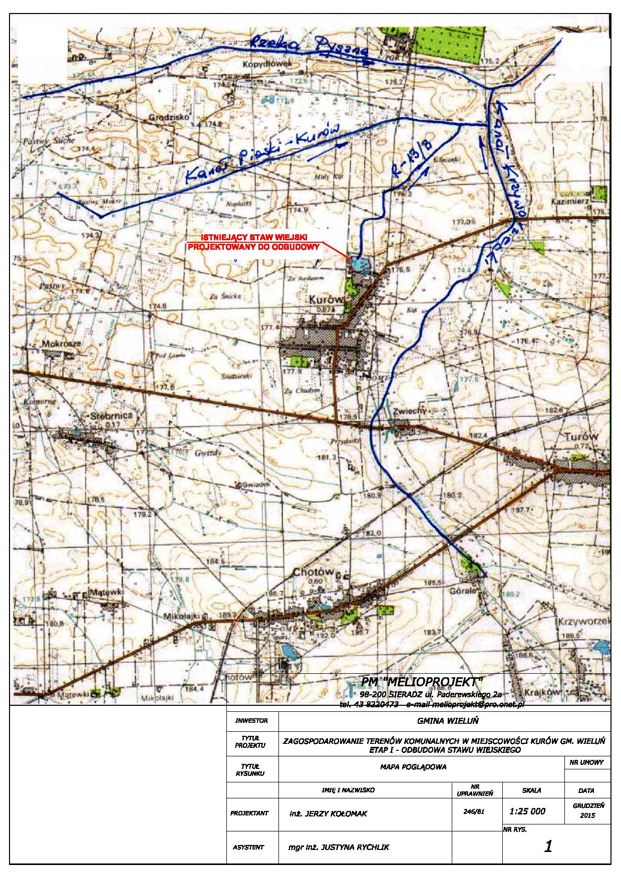 Opracowanie kompletnej dokumentacji projektowo - kosztorysowej dotyczącej Zagospodarowanie terenów komunalnych poprzez odbudowę stawu wiejskiego w Kurowie w ramach zadania Odtworzenie stawu na działce gminnej nr 678/4 – Rada Sołecka w Kurowie.